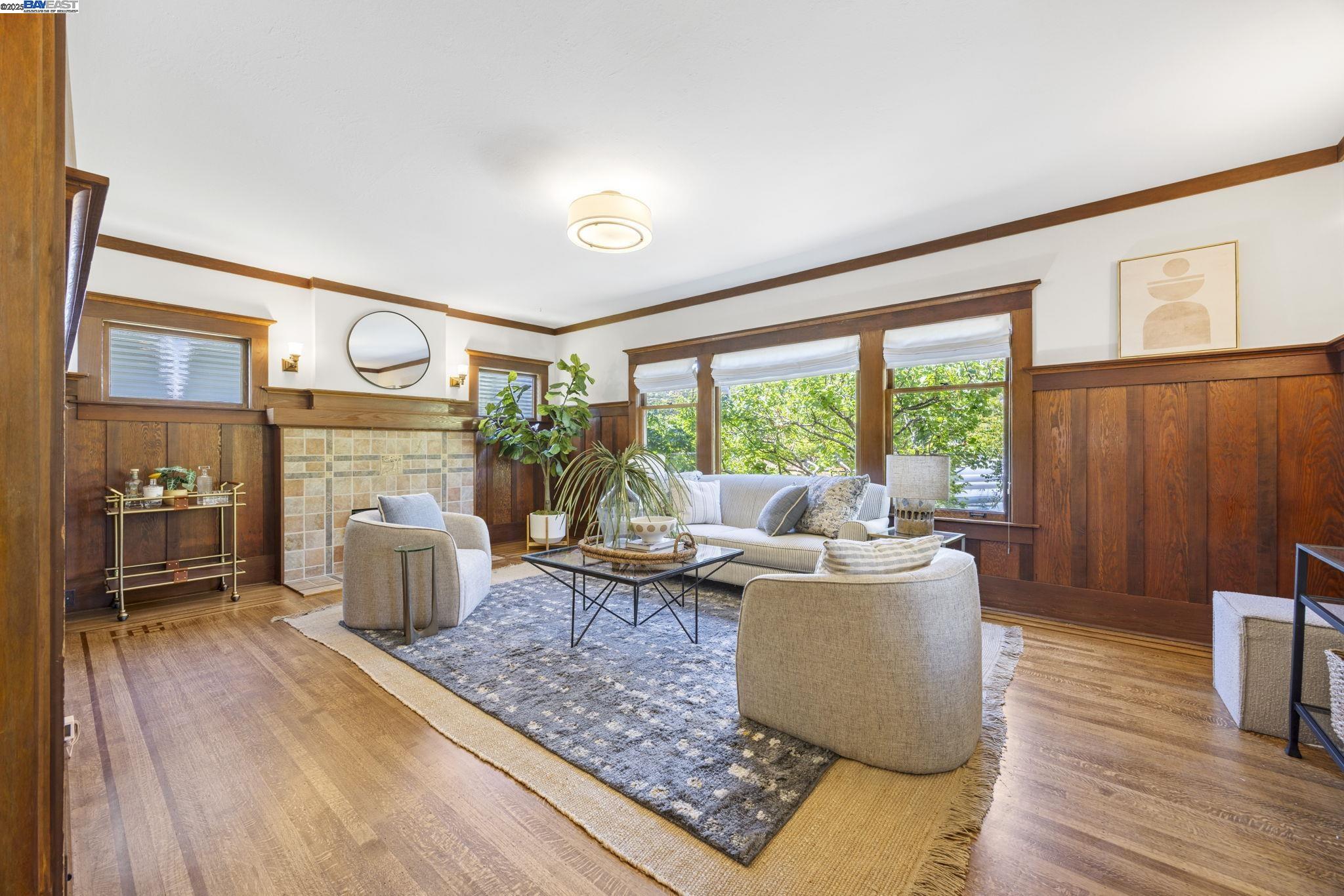 Located in one of the most picturesque neighborhoods in all of Alameda, this spacious 1910 shingled Craftsman has charm to spare both inside and out! Situated on an unusually large corner lot, the home features 4BR, 2BA, a formal foyer, impressive living & dining rooms, a kitchen w/adjoining laundry room, a detached garage & a large front sitting porch surrounded by a lovely garden & mature fruit trees. Inside, period architectural details include Douglas fir wainscot panels, untouched window & door trim, picture rails, crown moulding + oak floors w/rosewood borders. The DR has bay windows, a fireplace & a spectacular Odeon crystal chandelier/ The spacious LR has a fireplace w/a gorgeous Craftsman tile surround & much more. The primary BR suite includes a sunny ensuite nursery/home office/flex room, a cedar-lined closet + a Harlow crystal light fixture. The 2 sun-filled upstairs bedrooms have vintage tongue & groove paneling, skylights & built-in book shelves. Wonderful front & back yards include pavers + 7 varieties of fruit trees. Detached garage presents possibilities. Off-street tandem parking for multiple cars. This is a truly exceptional vintage home in a sought-after Alameda High School location w/classic Craftsman features, & lush, very private outdoor spaces. Perfection!